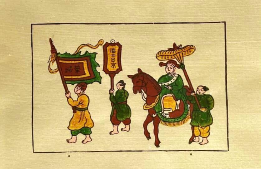 Bức “Vinh quy bái tổ” – Tranh dân gian Đông Hồ. Hình ảnh ngựa, lọng, cờ quạt trong tranh khắc họa cảnh người đỗ đạt vinh quy trở về làng, biểu trưng cho công danh thành tựu.